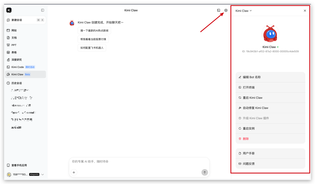 或在设置中选择"重启KIMI Claw"。系统会提示重启状态。