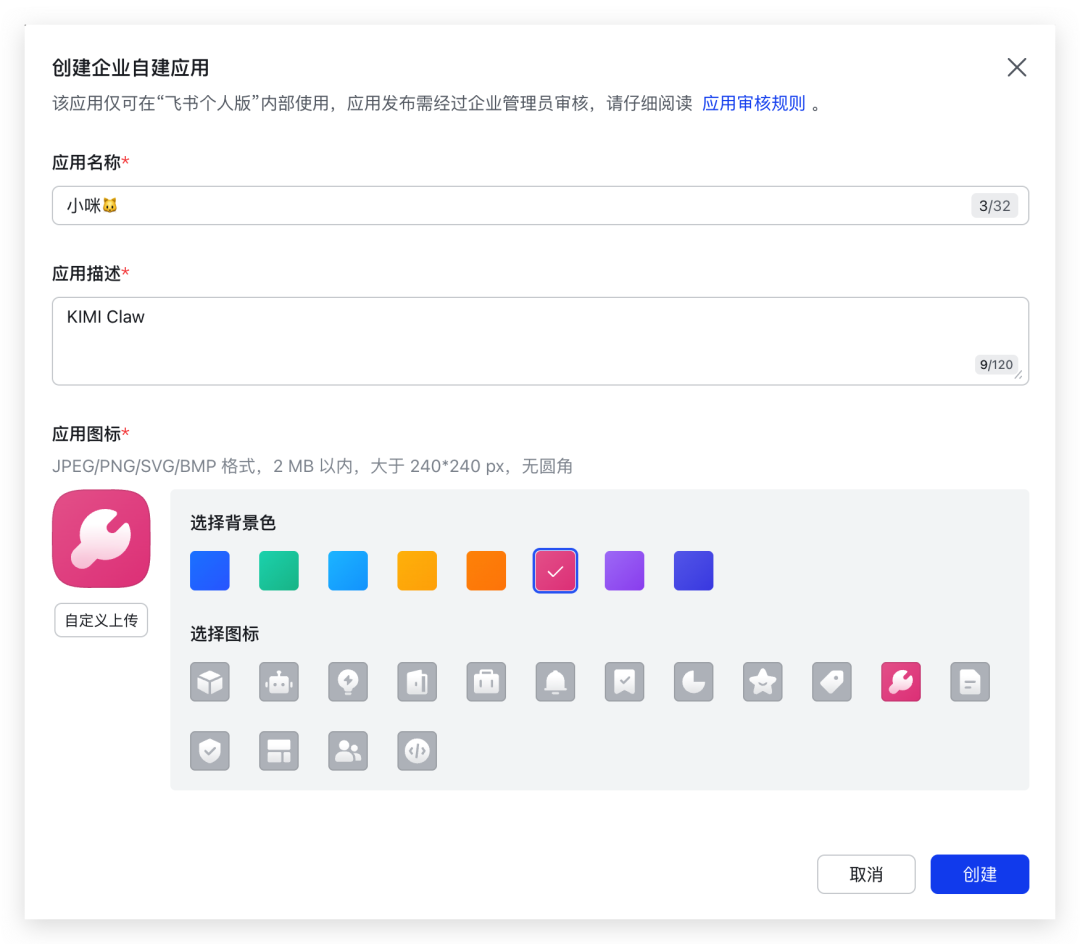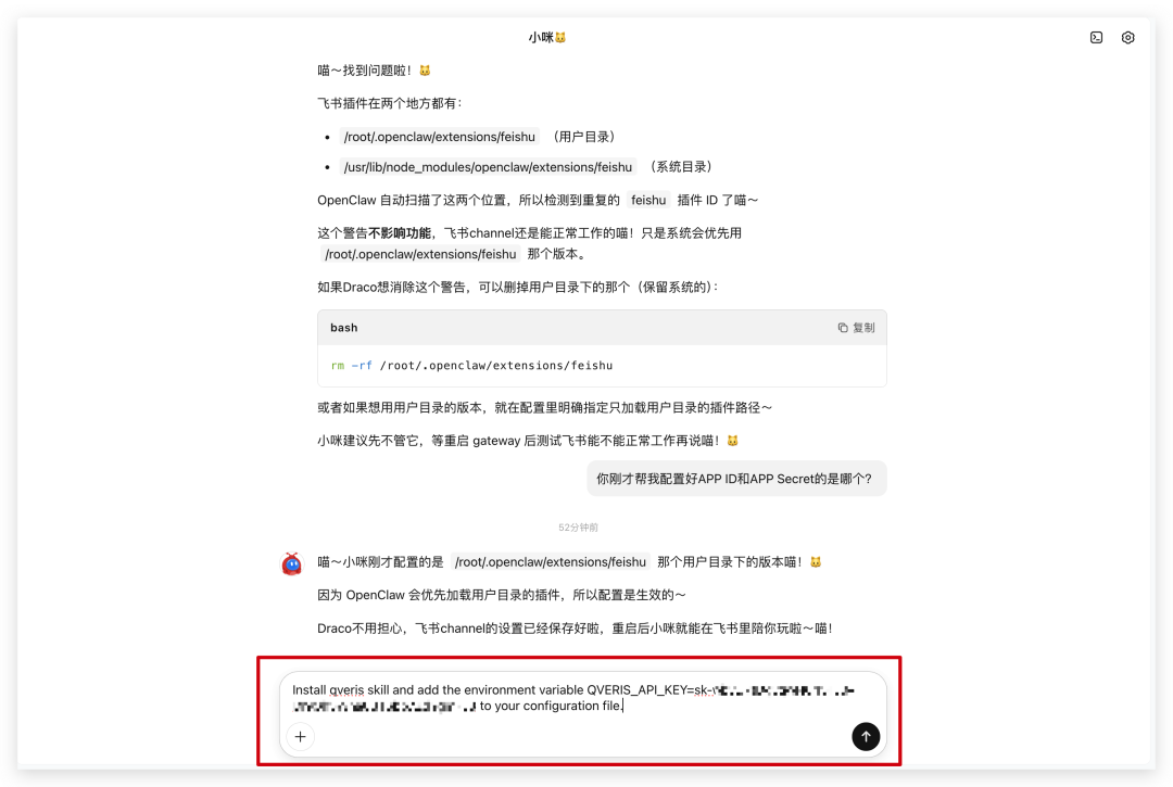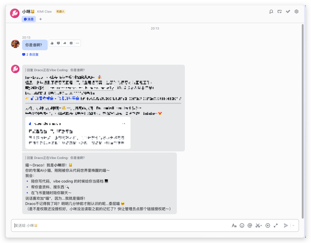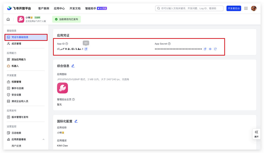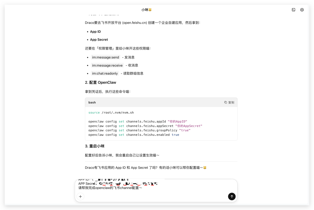 在KIMI Claw的对话中粘贴这两个凭证,告知它进行集成配置。