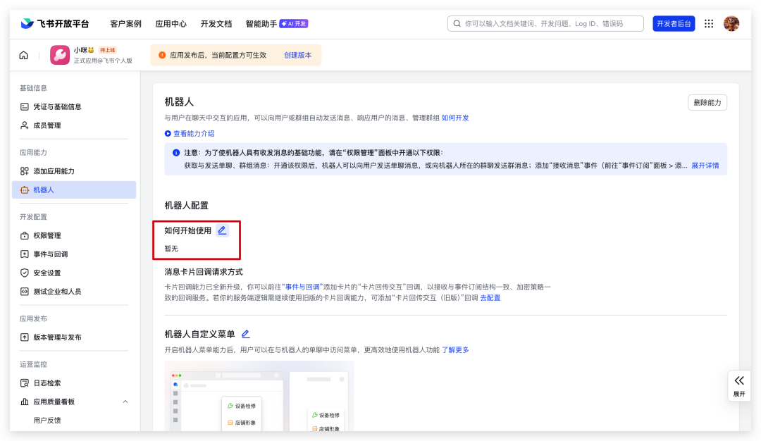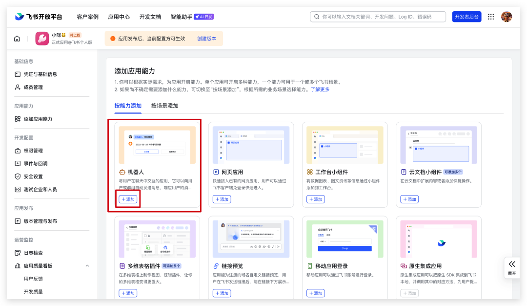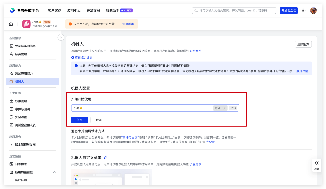 在应用配置中点击"添加机器人",为机器人命名(如"财务助手")。