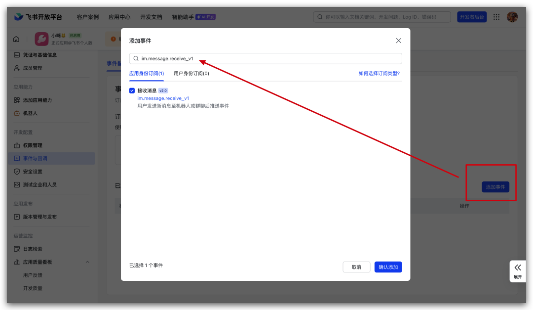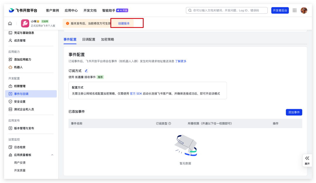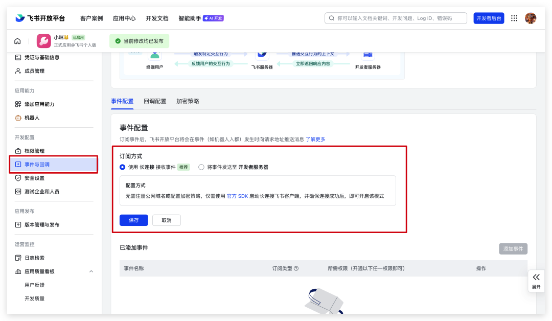 返回飞书开放平台"事件与回调"页面,选择"长连接"模式。