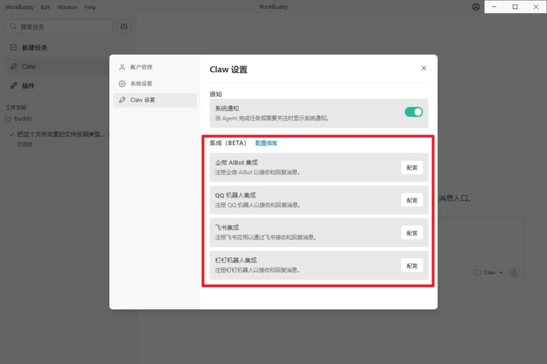 打开 WorkBuddy 中的 Claw 功能,就能无缝接入到企业微信、飞书、钉钉、QQ等日常 IM 工具中。