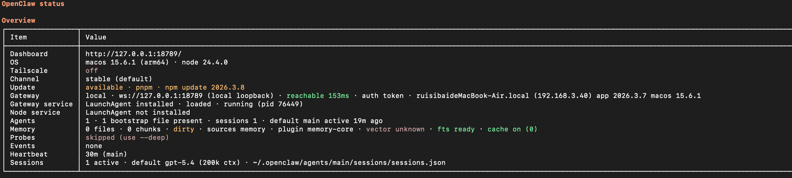 - 底部会提示是否有新版本(如提示升级到 v2026.3.8),并给出更新指令:
