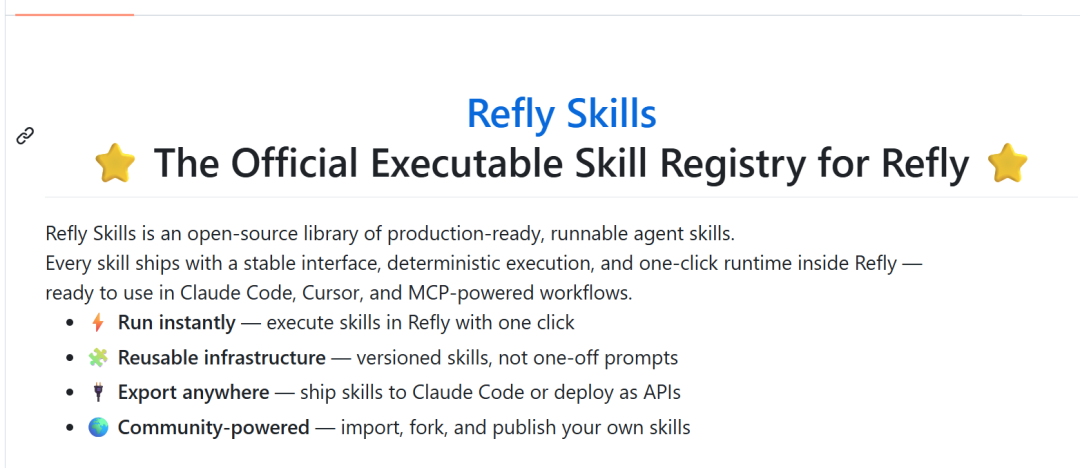 核心定位: Refly Skills是一套开源的工作流创建工具集,允许用户在Claude Code或OpenClaw等第三方开发环境中直接调用Refly平台的工作流生成能力,而无需登录Refly网页平台。