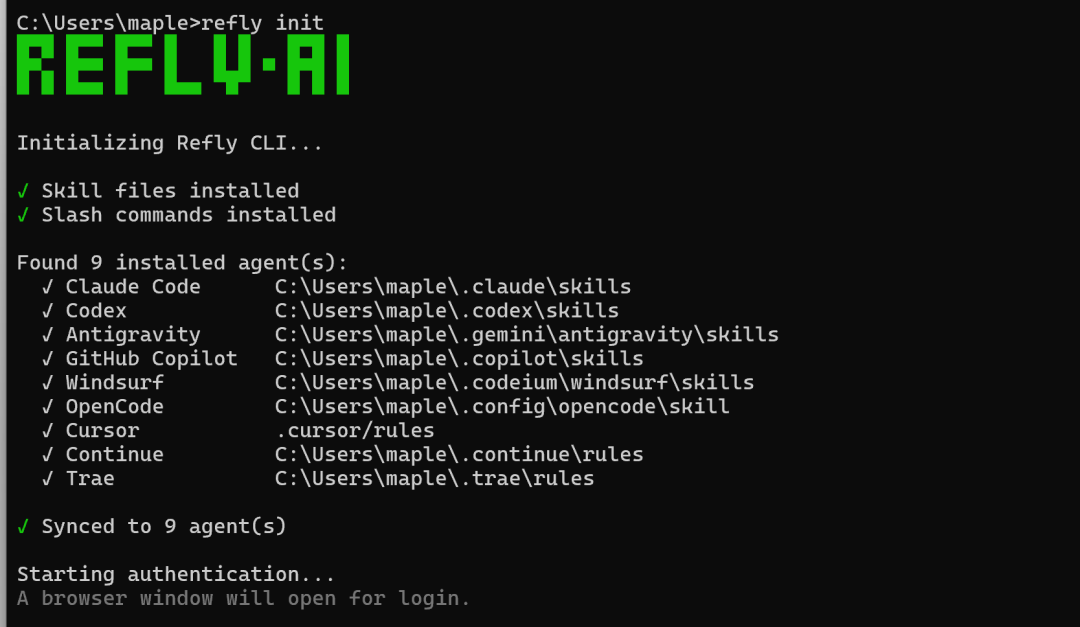 安装后执行 refly init 完成平台授权