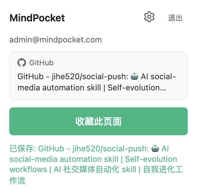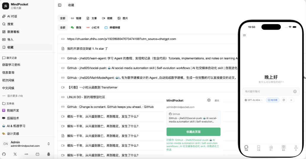 | MindPocket | ✓ | 摘要+RAG对话 | ✓ | Web+移动+扩展 |