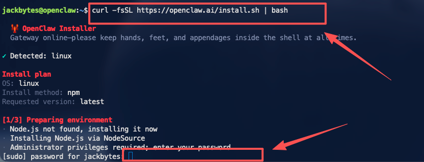 连接成功后,执行OpenClaw官方安装脚本: