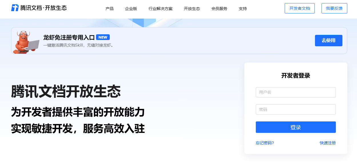 腾讯文档开发平台地址:https://docs.qq.com/open#/login