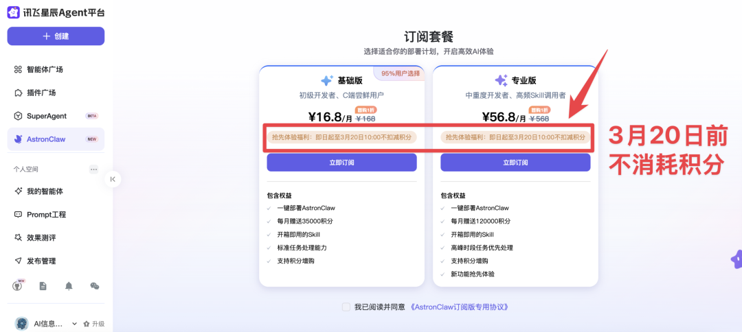 https://agent.xfyun.cn/astron-claw(3月20日前订阅,对话不扣积分)