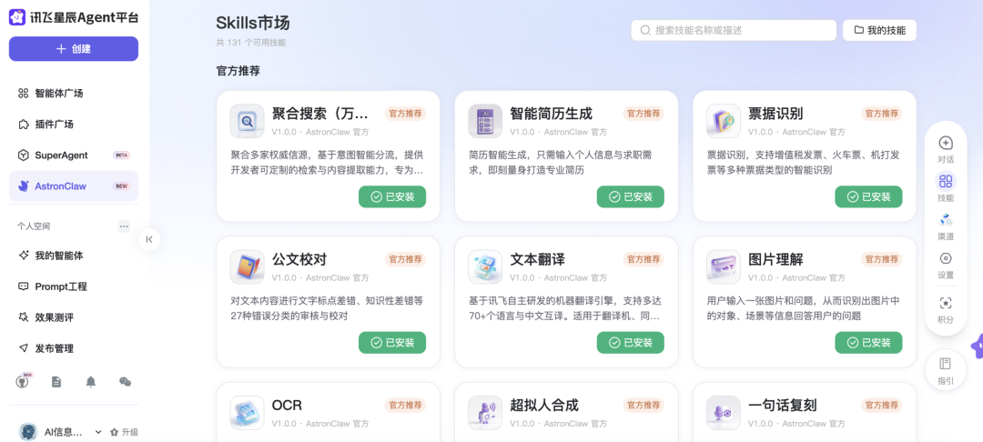 - Skills市场:130+官方审核过的技能,包含讯飞独有的「超拟人语音合成」等高级功能