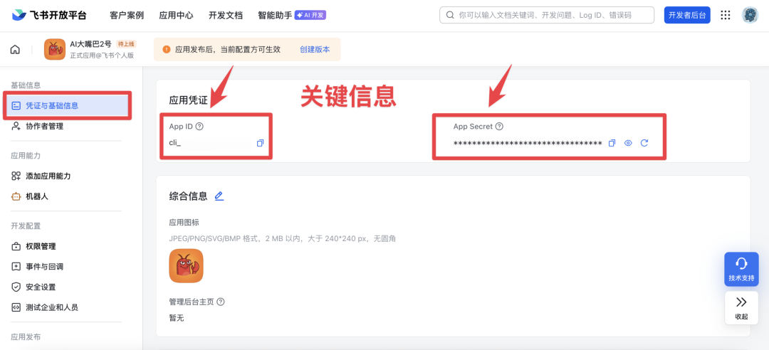 进入应用详情,在「凭证与基础信息」获取App ID和App Secret