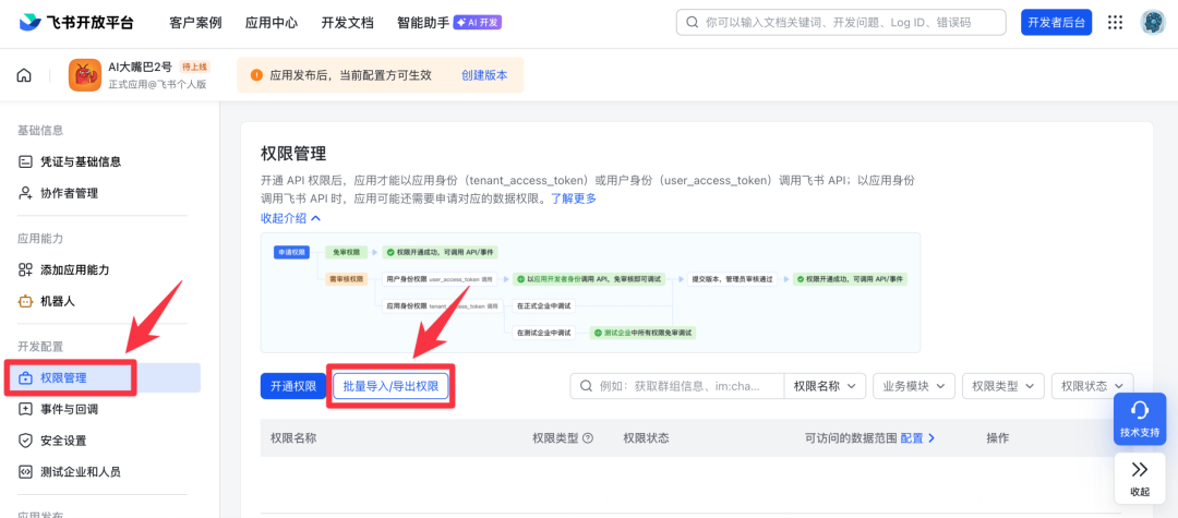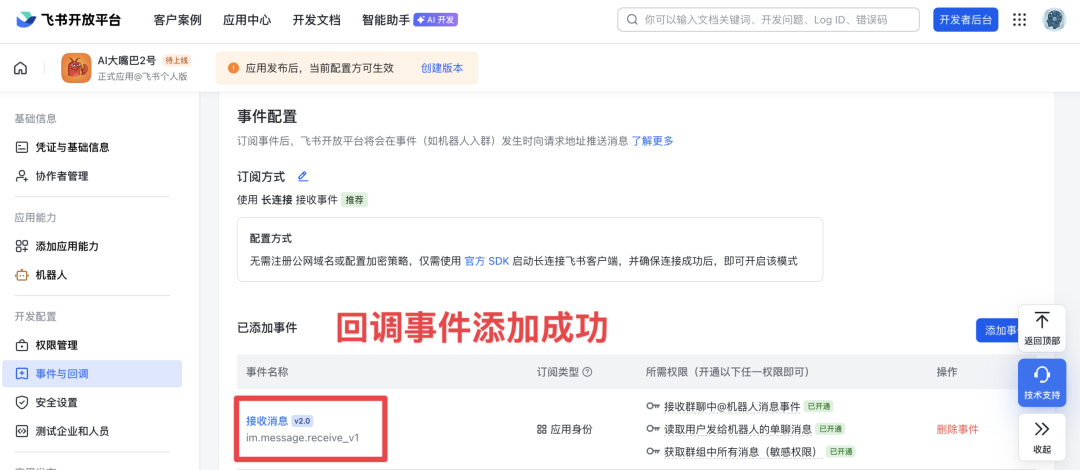 注:权限配置不能跳过,否则机器人无法接收消息。
