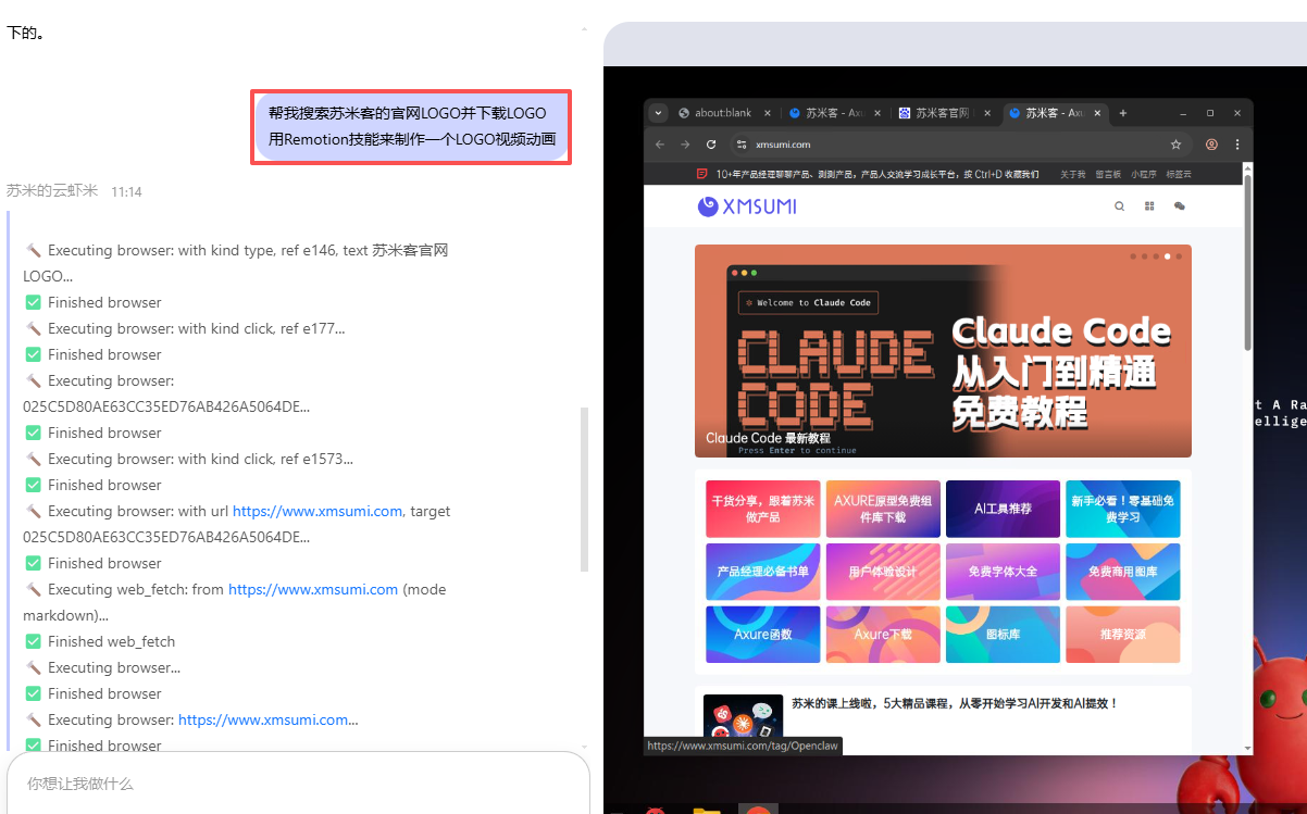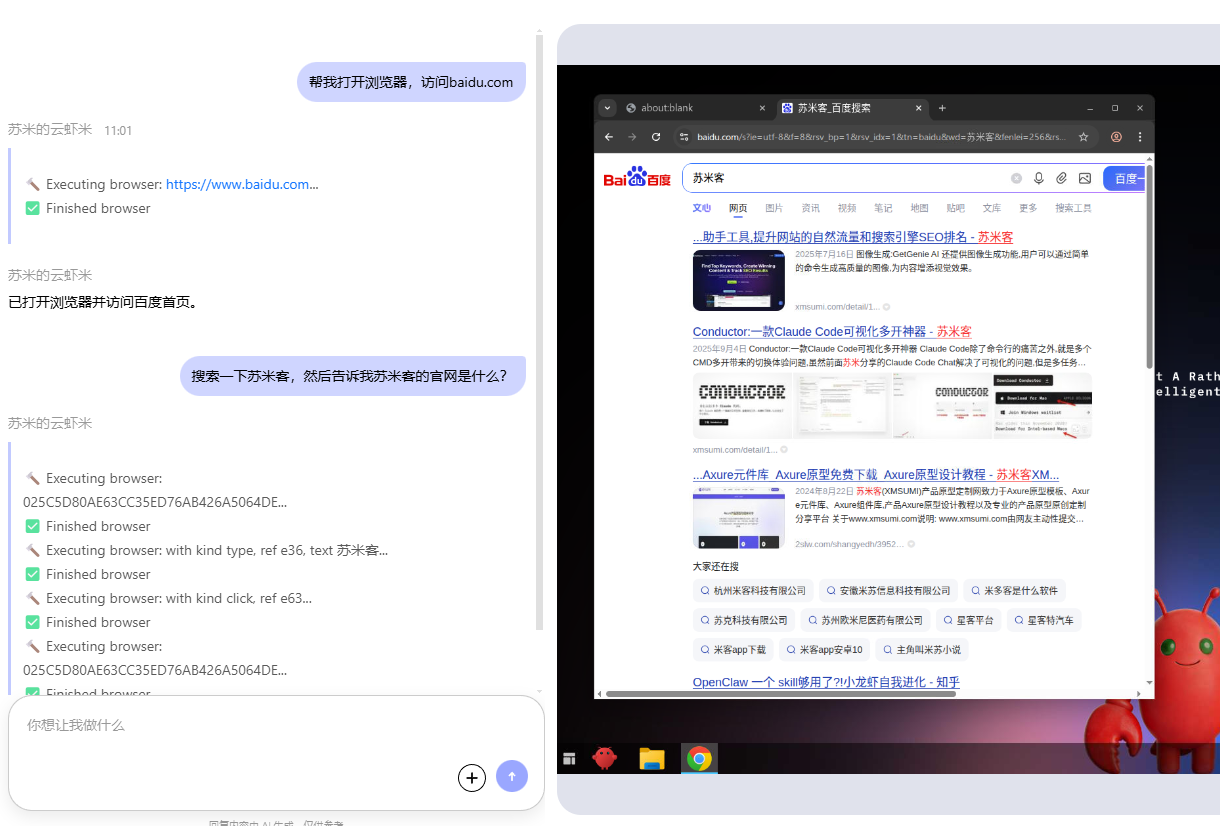 AI 在执行任务时,用户可以看到完整的操作过程,例如: