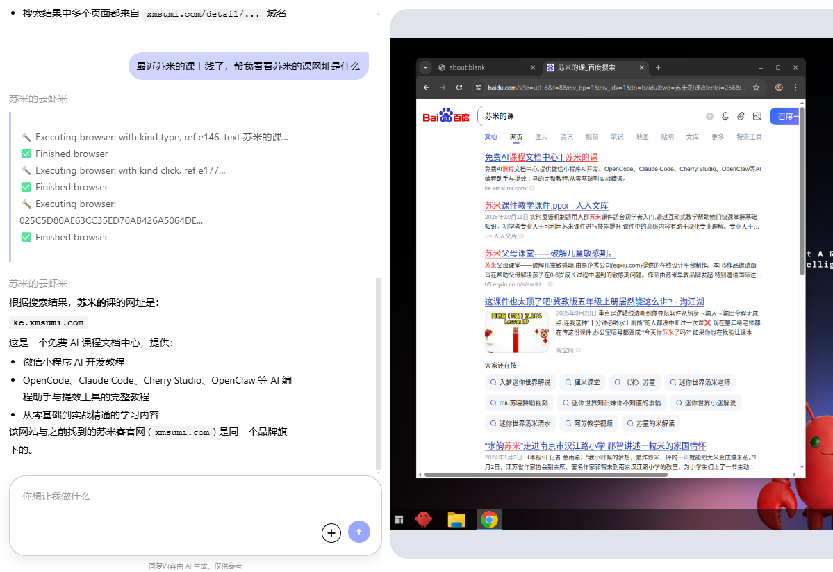 帮我打开浏览器,访问百度,搜索一下苏米客,然后告诉我网址是什么?