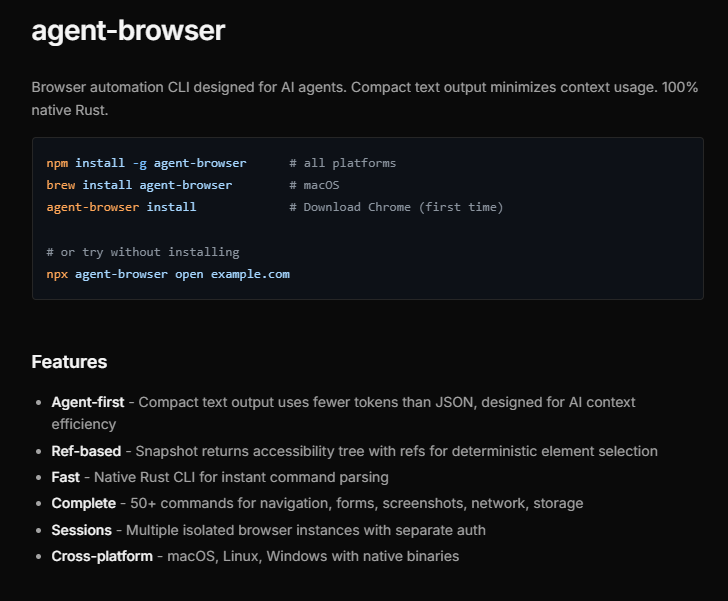 agent-browser 的价值定位很清晰:它不是要替代通用自动化工具,而是填补 AI Agent 在浏览器交互领域的专用需求。