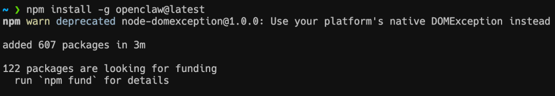 该命令会下载并安装 OpenClaw 及其依赖包(通常包含 600+ 个包),预计耗时 3 分钟左右。