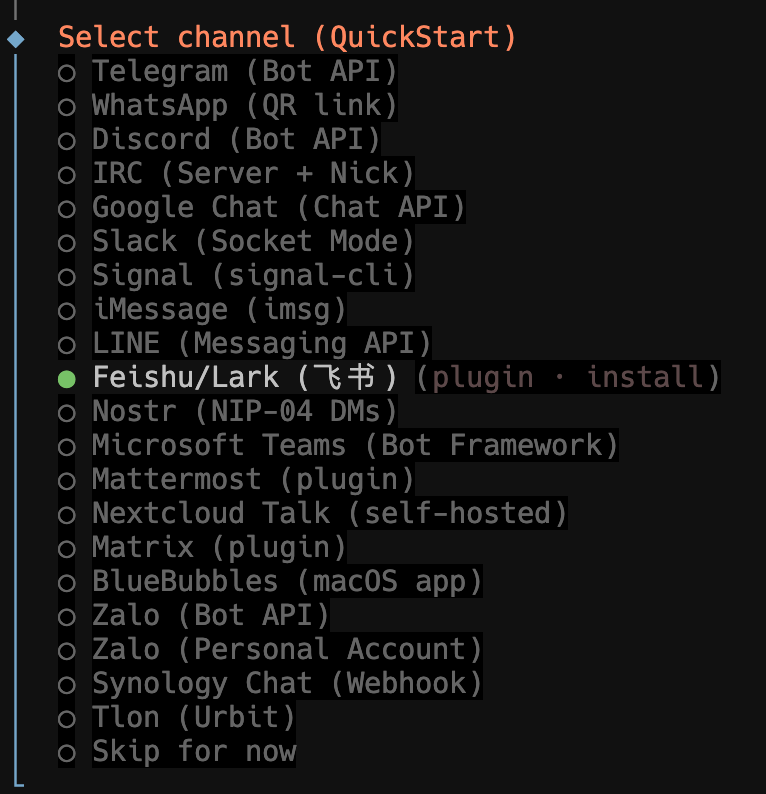 在本教程中,我先将其接入飞书,然后再通过微信插件扩展。
