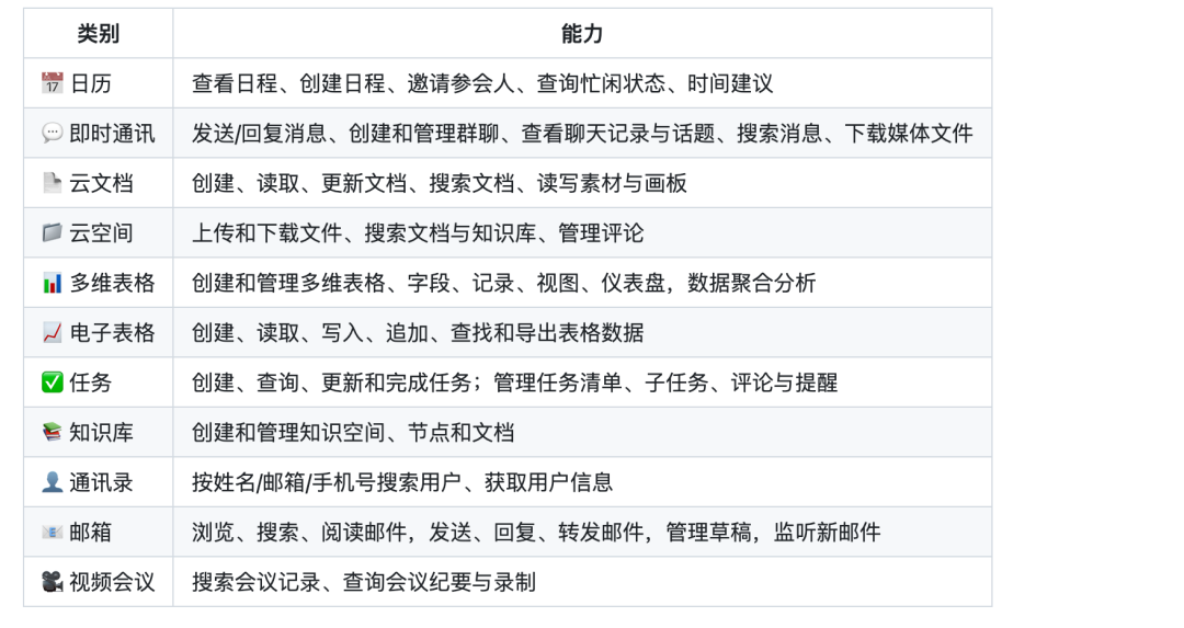 这意味着你可以直接用自然语言指示AI助手:"帮我整理今天的会议纪要,生成飞书文档,并发送到项目群"。