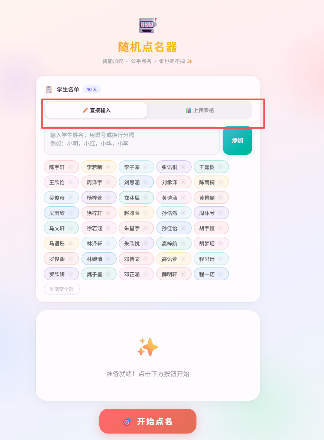 - 学生名单:支持直接输入和 Excel 表格上传两种方式
