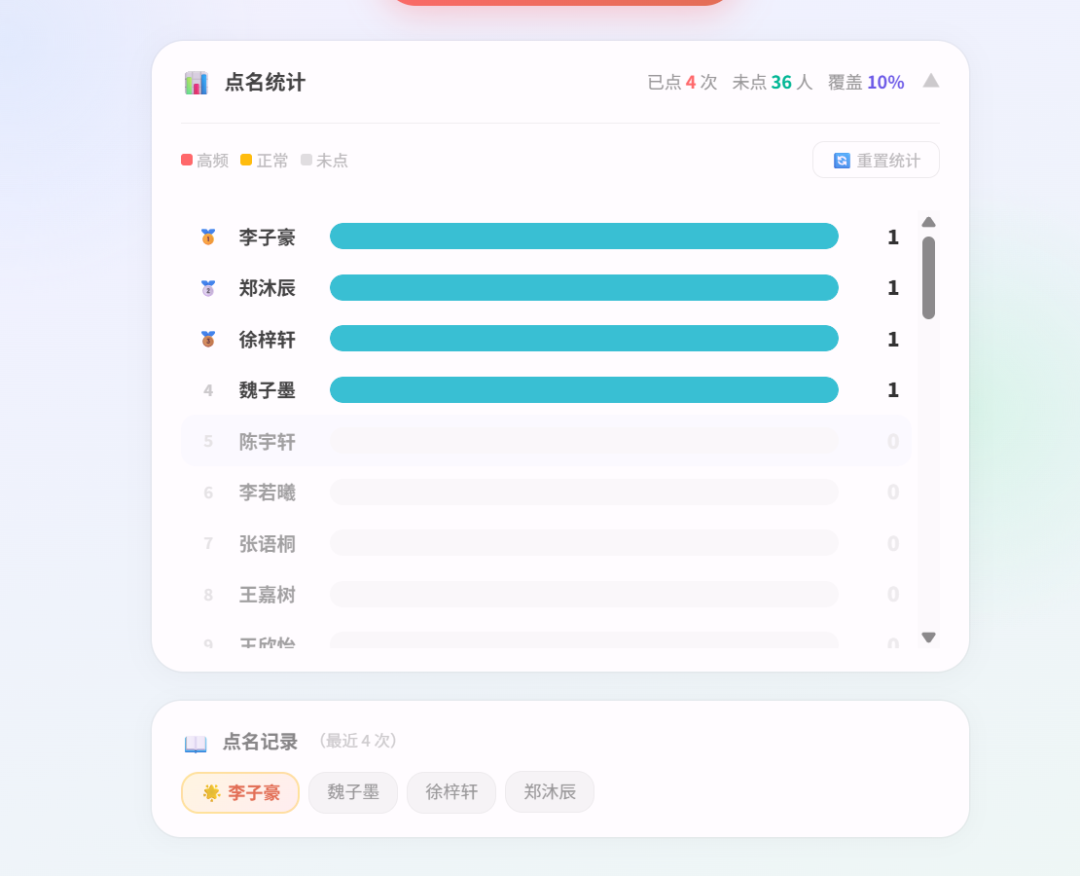 统计面板:显示每个学生的被点次数柱状图、总点名次数、未点人数、覆盖率,支持重置统计。