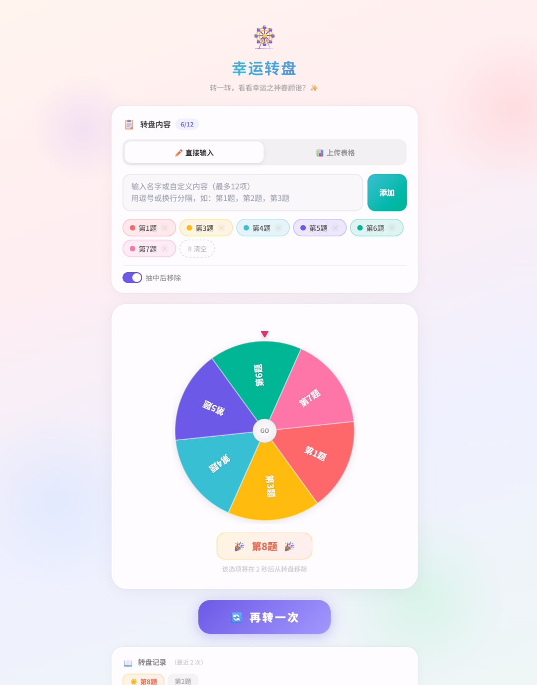5. 支持自定义转盘内容(不仅限于名字,也可以是任务/题号等)
