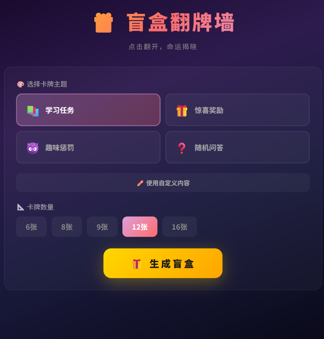 支持自定义卡牌内容,可选卡牌数量(6/8/9/12/16张),卡牌背面朝上排列成网格。