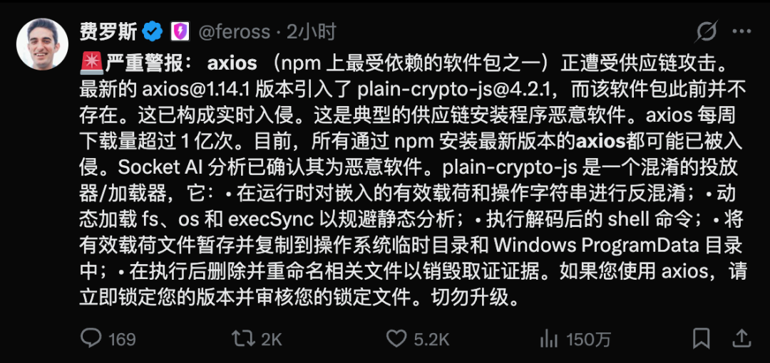 axios(npm 上周下载量超过 1 亿次的核心依赖库)在最新版本中被植入恶意代码,这是一起典型的供应链安全事件。