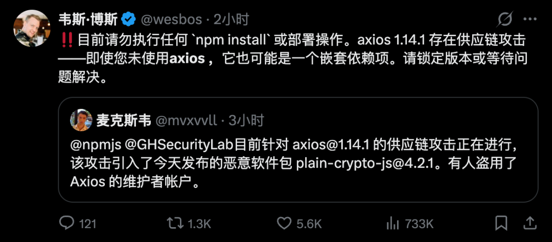 - axios 本身无恶意代码:所有攻击逻辑都隐藏在传递依赖中,常规审计难以发现