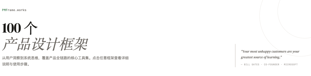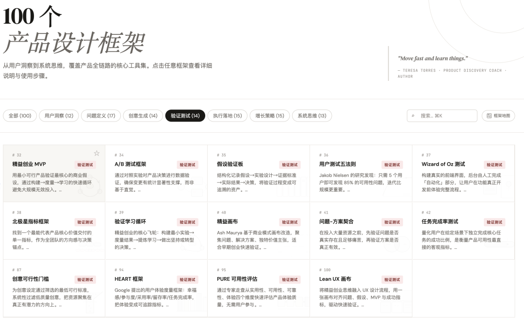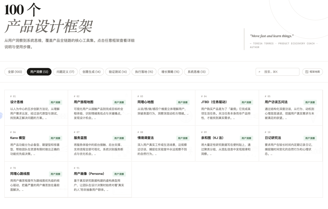 而PMFrame(产品框架知识库)似乎试图填补这一空白,通过集合100个产品设计框架,为产品团队提供一个可检索、可复用的方法论库。