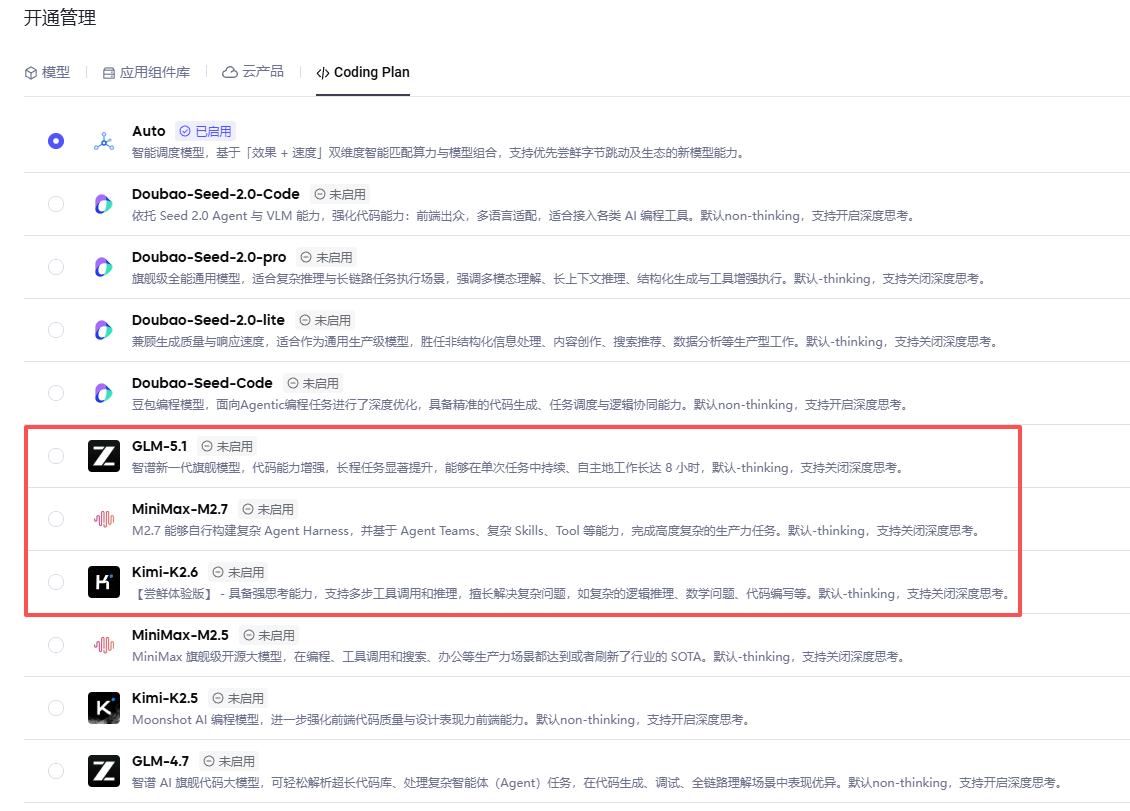 近期还新增了 MiniMax-M2.7、GLM-5.1 模型接入。