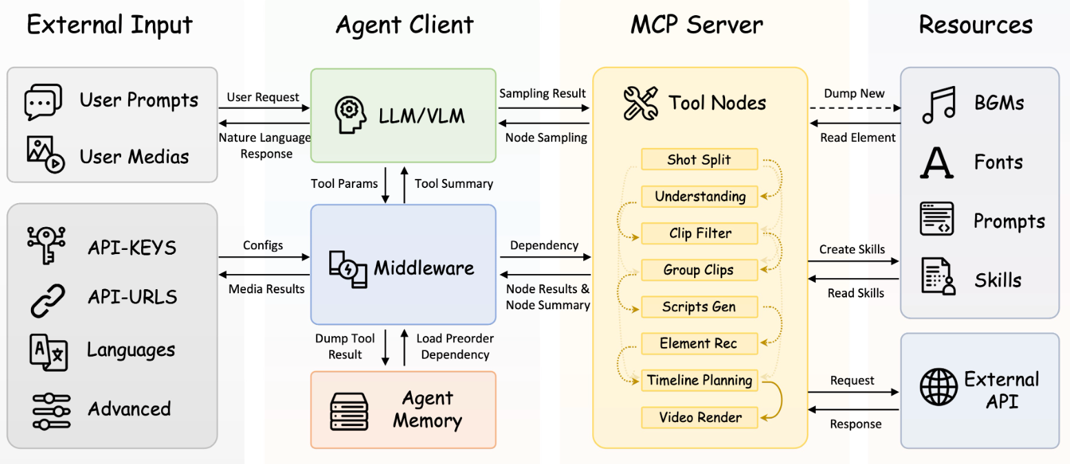 与传统的视频编辑工具不同,FireRed-OpenStoryline 不要求用户掌握时间轴操作、转场技巧或配乐知识。它通过大语言模型和多模态理解能力,将视频创作拆解为可自动化的流水线。