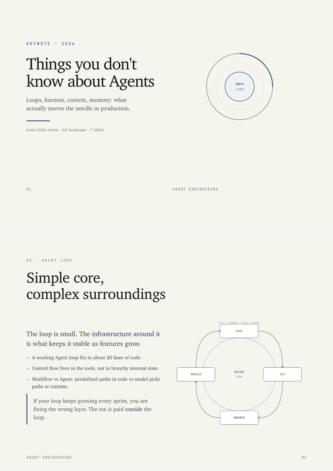 后来做演讲《The Agent You Don't Know》,需要一套和文档风格一致的幻灯片,这轮迭代加入了内联 SVG 图表、统一暖色调、收紧编辑节奏。最终发现这套东西覆盖了所有文档需求,就独立出来成为 Kami。