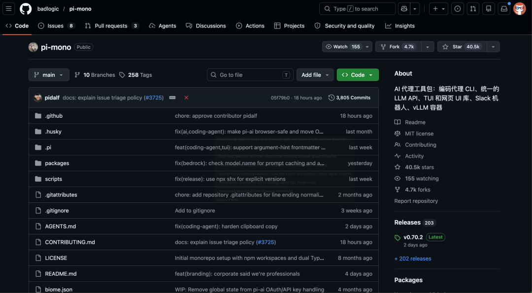 2026 年,AI Agent 开发已经进入了「站在巨人肩膀上」的阶段。如果你正在寻找一个足够干净、足够灵活的底层框架来构建自己的 Agent,pi-mono 是目前 GitHub 上最值得深入研究的项目之一。