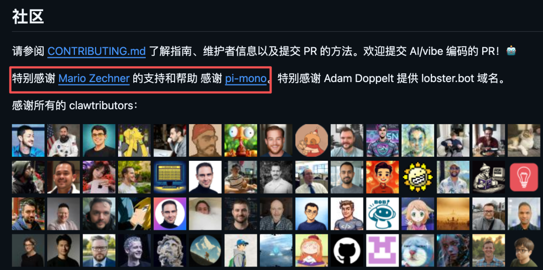 这个 TypeScript 单仓项目已经突破了 4 万 Star,而它的成功有一个重要的佐证:OpenClaw 的核心运行时正是基于 pi-mono 的 SDK 构建的。OpenClaw 在 README 中专门感谢了作者 Mario Zechner 和 pi-mono 项目。