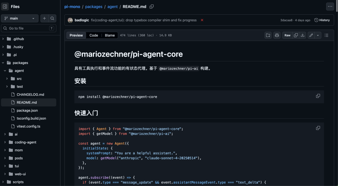 pi-mono 是一个专门用于构建 AI Agent 和管理 LLM 部署的 TypeScript 单仓项目。它的核心产品叫 Pi,是一个运行在终端里的编程 Agent,支持在项目中直接读文件、写文件、编辑代码和执行命令。