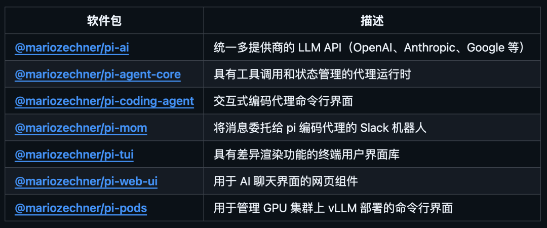 pi-mono 把 Agent 开发需要的每一层都拆成了独立的 npm 包,每个包都可以单独使用: