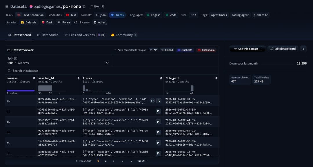 OSS Session 分享计划:作者鼓励用户将真实的编程会话数据发布到 Hugging Face,包含完整的工具调用、失败和修复过程。这比玩具基准测试更有价值。作者自己在 Hugging Face 上已公开了 627 条以上的 pi-mono 工作会话。