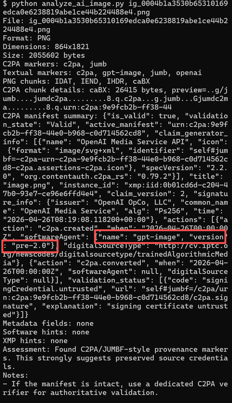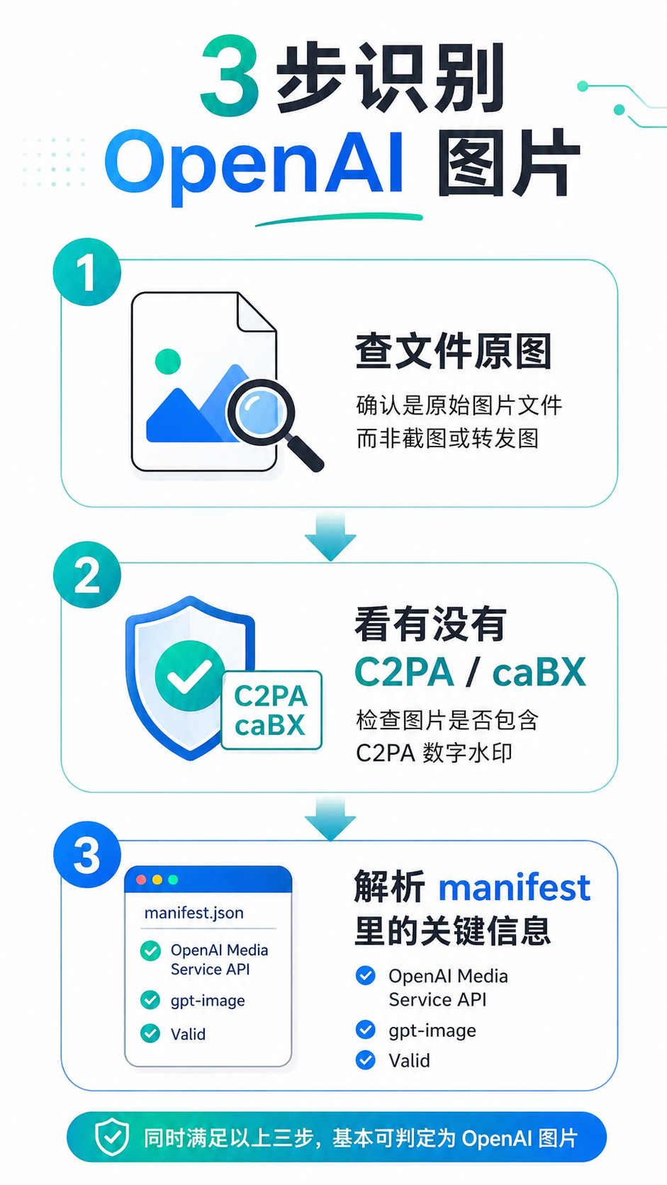 随着 OpenAI GPT-image-2 等模型生图质量越来越高,肉眼已经越来越难区分 AI 生成图片和真实图片。真正有效的识别方法,是检查图片是否包含 C2PA 凭证。