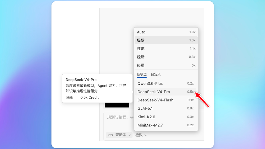 想粗略看 DeepSeek V4 的定位,可以先看 Qoder 里的消费倍率。根据经验,模型能力越强,通常成本越高,倍率也会更高。这个倍率不是严谨评测,但和实际体感比较接近。