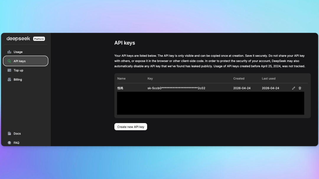 第二步:在平台里创建 API Key