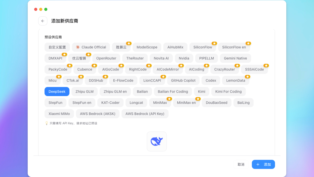 安装好后,在右上角添加模型服务商,选择 DeepSeek,填入模型名称和 API 信息。回到主界面切换到 DeepSeek,打开 Claude Code 等工具就可以直接使用了。