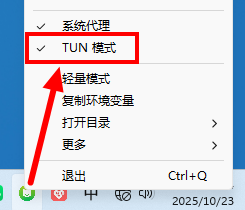 安装界面如果一直停在“正在下载”,需要在网络软件中开启 TUN 模式(虚拟网卡);