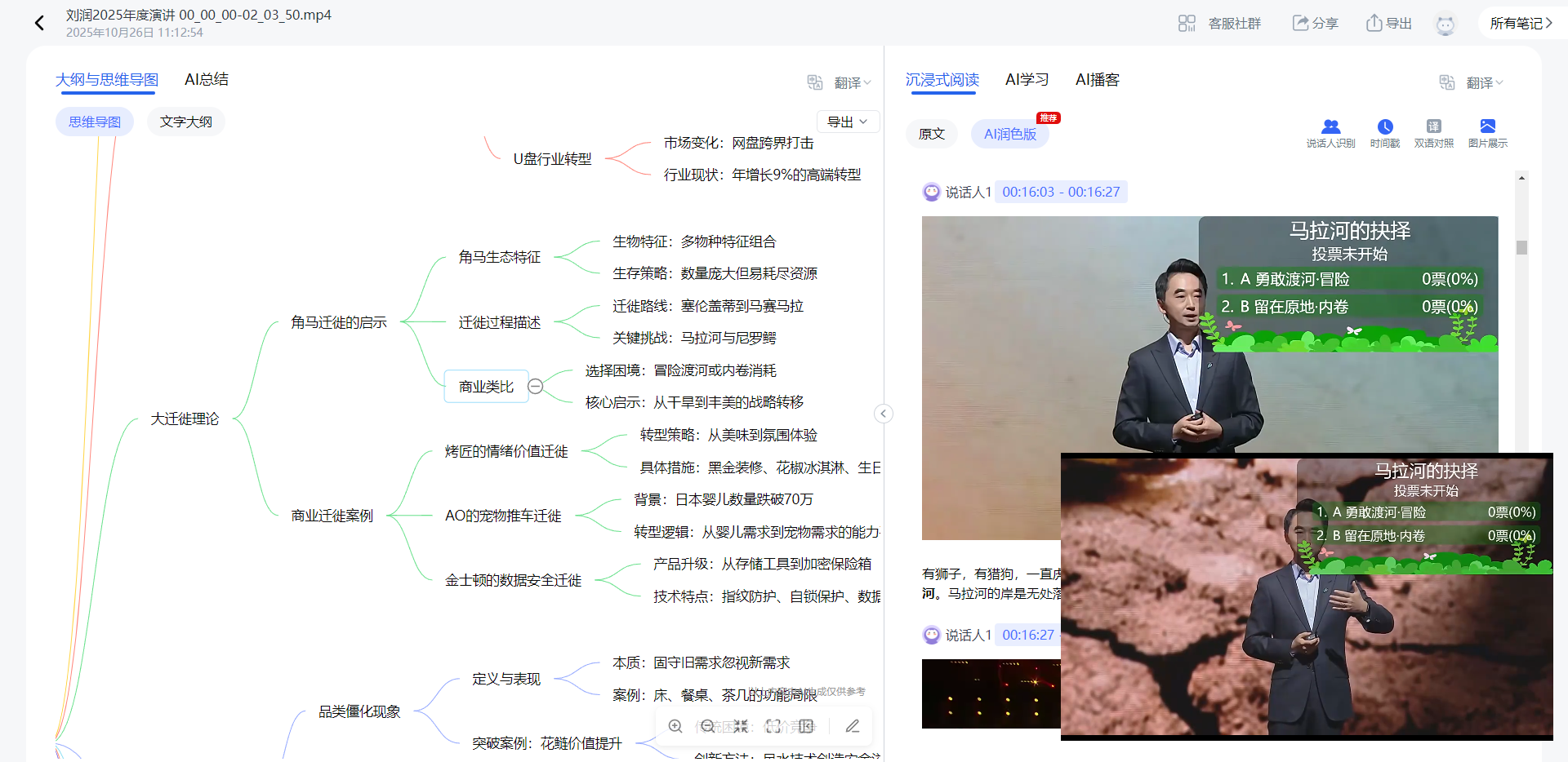 它支持视频转文字、AI总结、自动生成思维导图等功能,于是我决定换个方式:让AI成为我的学习搭档,陪我一起拆解这场演讲。这个过程本身,就像是一次关于"如何用AI提升学习效率"的实战演练。