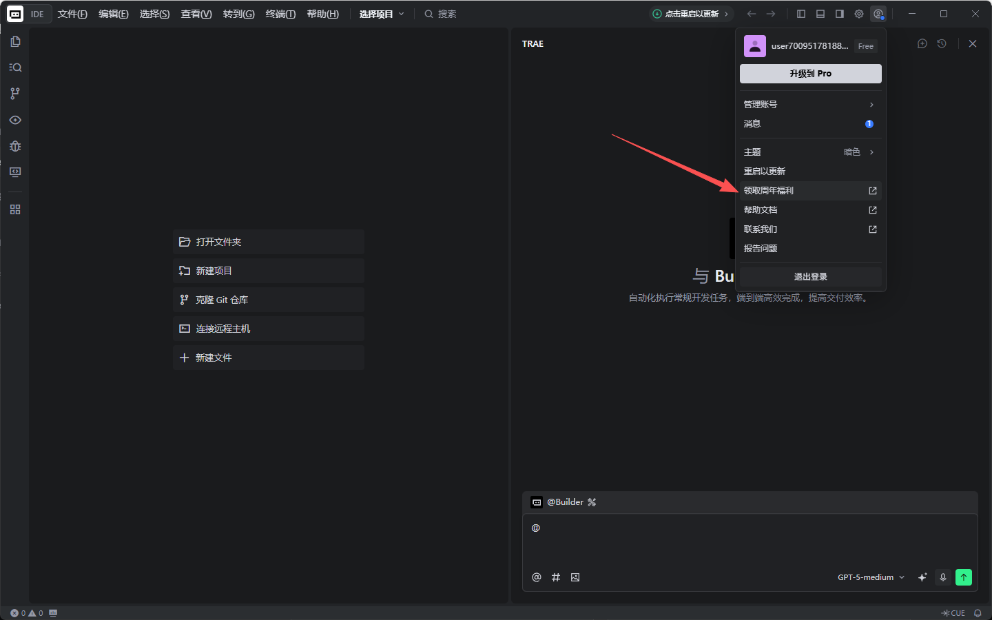 打开 TRAE 国际版 IDE,顶部有一个 Banner「领取周年福利」点进去就行;