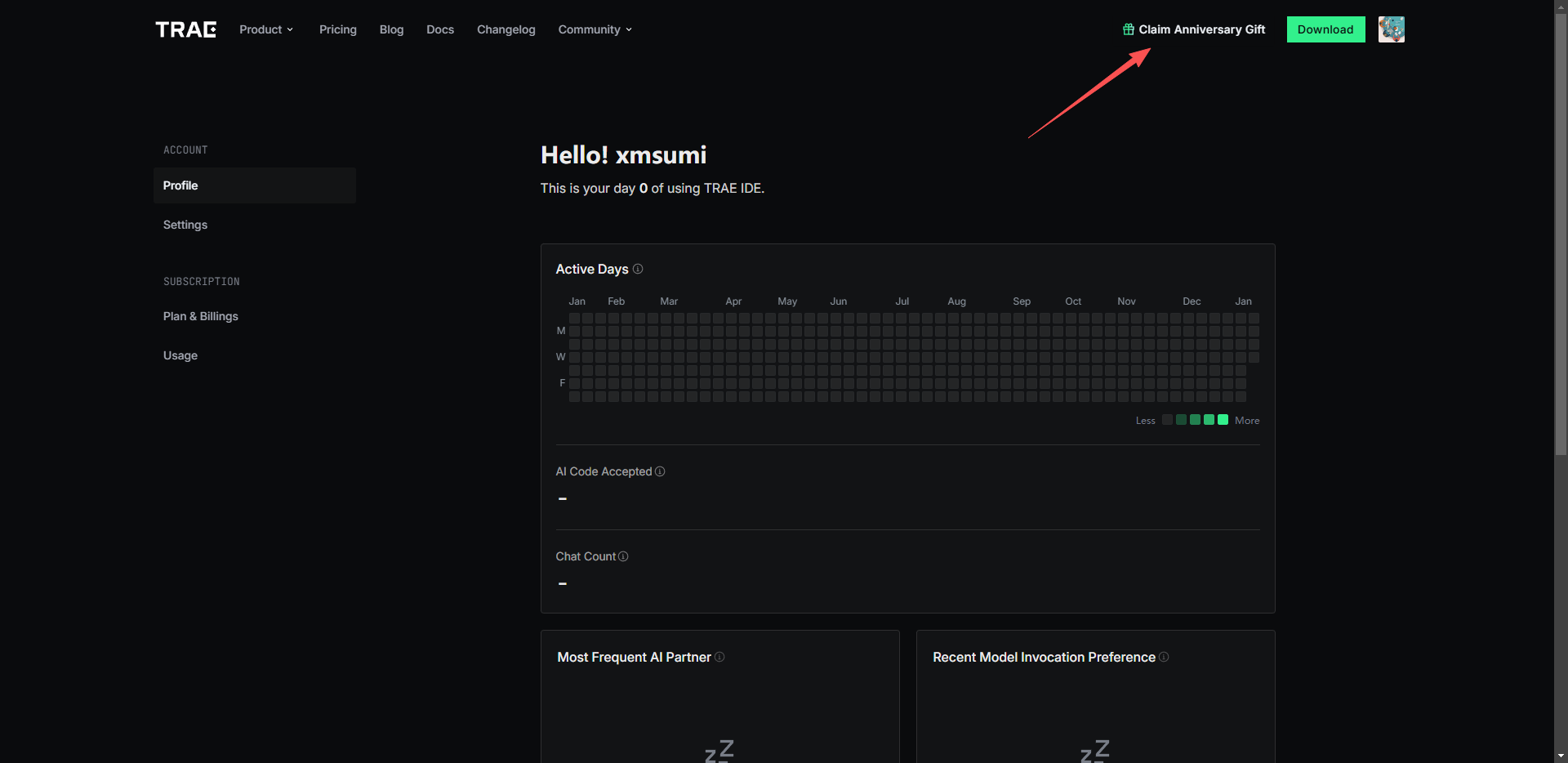 或者直接去官网 trae.ai,主页右上角有个「Claim Anniversary Gift」按钮,戳它!