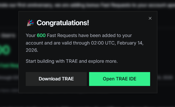 今天(1 月 14 日)上午 10 点开始,所有 TRAE 国际版用户,不管你是 Free 还是 Pro,统统送 Fast Request 额度!