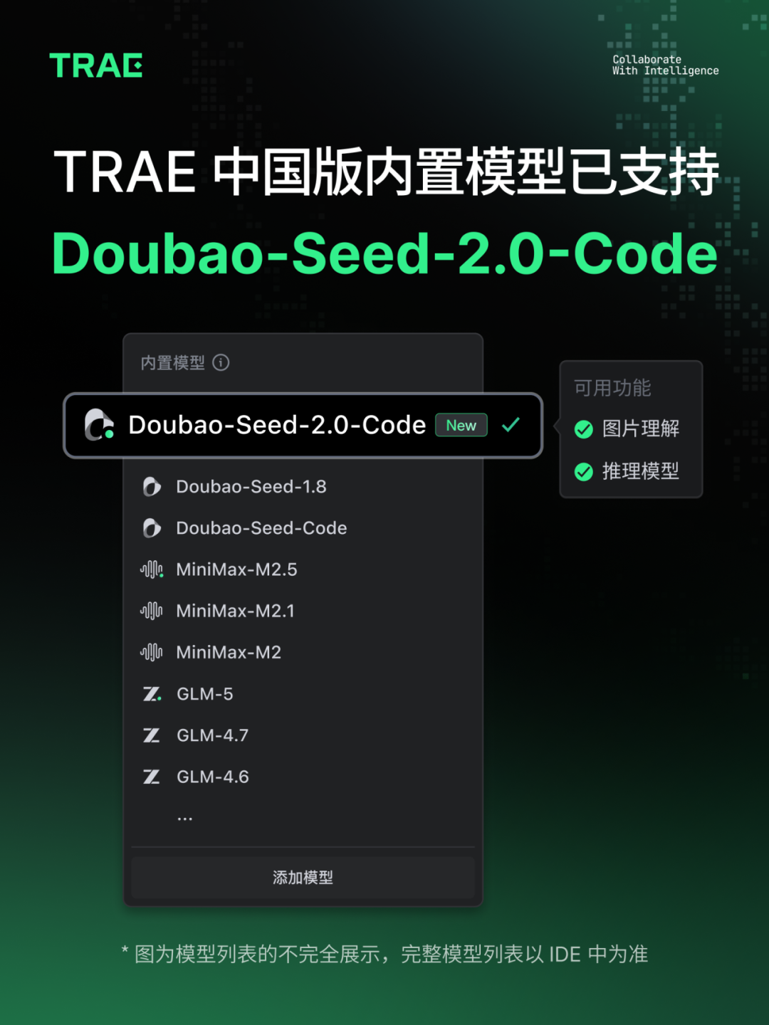 - TRAE:内置模型中选择「Doubao-Seed-2.0-Code」。
