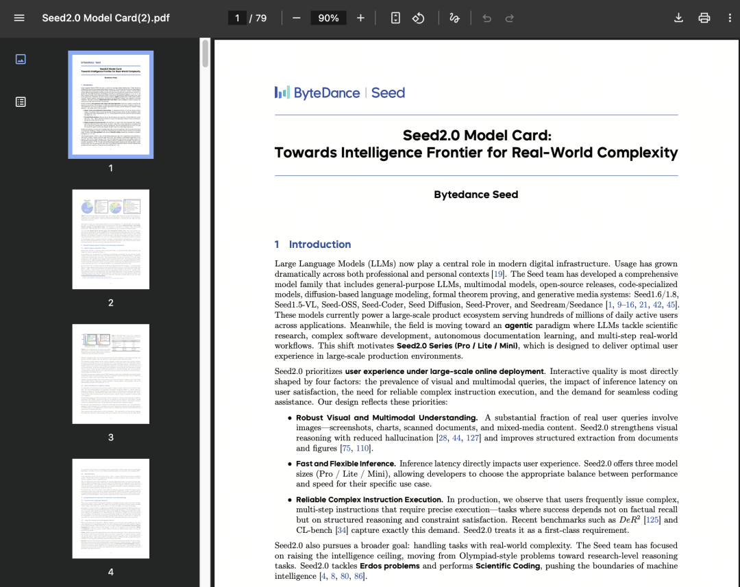 官方同步发布了 79 页 Model Card。关注公众号并回复「Seed2.0」即可获取。