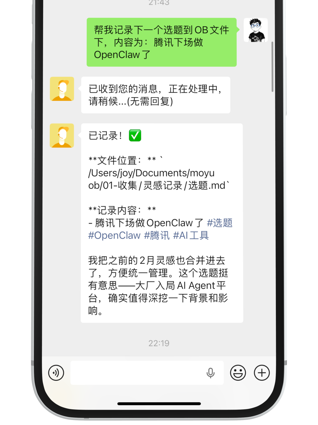 这一部分其实是最有意思的。完成基础配置之后,就可以直接在微信里与 OpenClaw 对话,并让它执行对应操作。