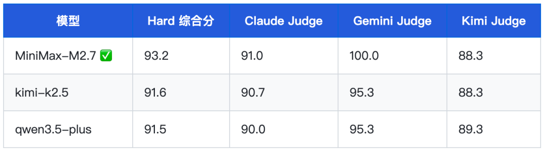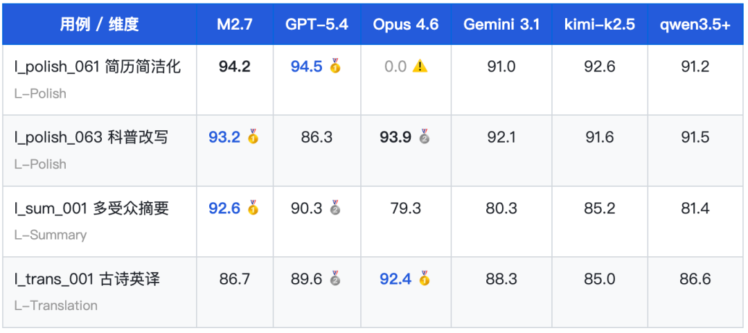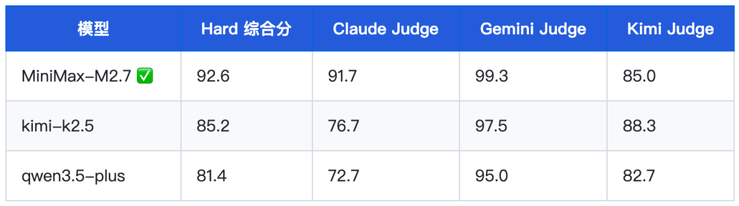 这一“排名倒挂”说明:M2.7 的综合榜表现受推理相关维度拖累,而其文字生成能力在实战中被低估。