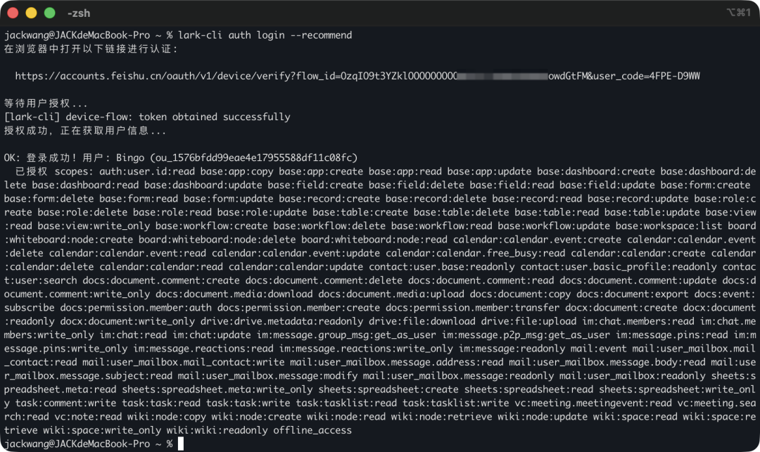 --recommend参数会自动选择常用权限范围(日历、消息、文档、表格、任务等)。
